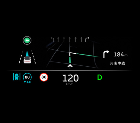 The enhanced HUD system features a 16.3-inch screen with 260,000-color display, smart background luminance control, as well as more refined and stable image. It shows a variety of practical content including information on driving, NAD and navigation, and zoomed-in intersections.